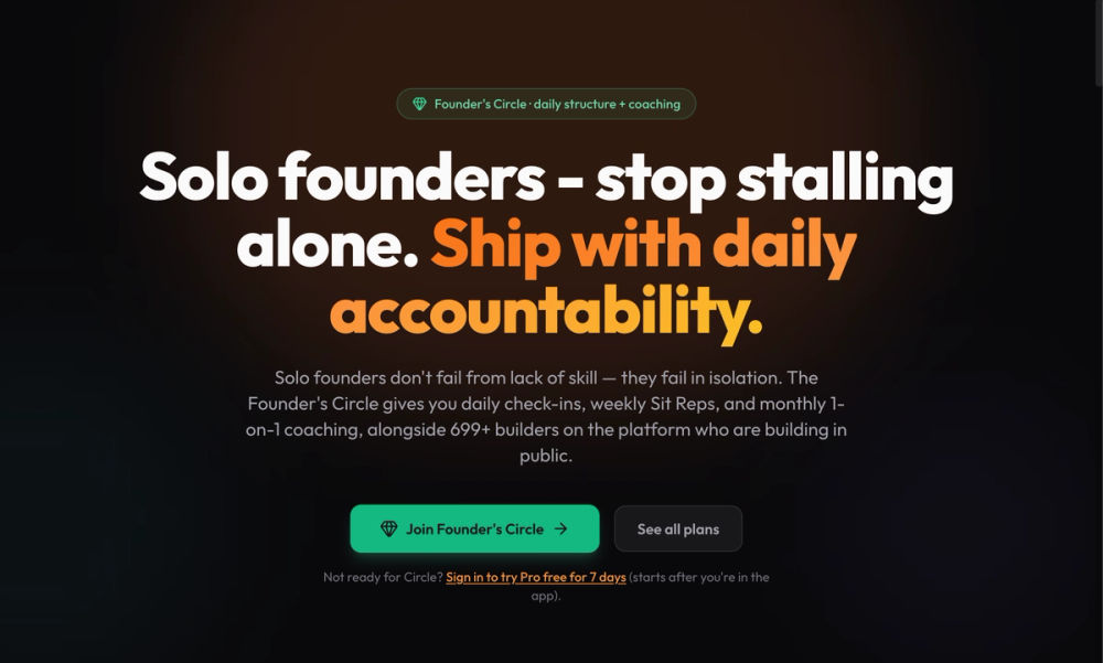 Builders.to is built to fix exactly that. It's an accountability platform and community for solo SaaS founders who are serious about shipping. At its core is the Founder's Circle — a structured membership that gives you daily check-ins, weekly Sit Reps over Zoom, and monthly one-on-one coaching calls. Not another group chat that goes quiet. Not another course you'll finish "someday." A real rhythm, with real people who notice when you go silent.