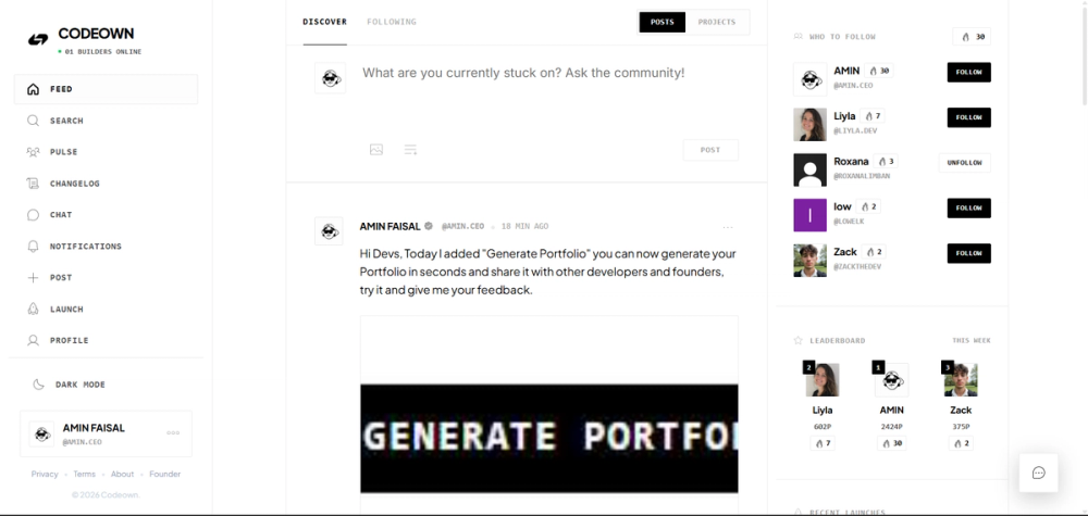 Codeown is a platform for developers to share projects, collaborate on code, and build their professional identity. Built by developers, for developers.