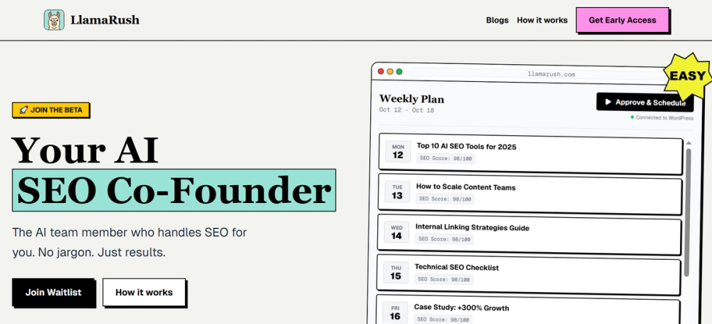 LlamaRush is an AI-powered SEO tool that works like a smart assistant for your website. Instead of spending hours researching keywords, analyzing data, or planning blog content, LlamaRush does everything for you automatically. You simply connect your website or Google Search Console, and the tool studies your site to understand what you’re already ranking for and where you can grow.