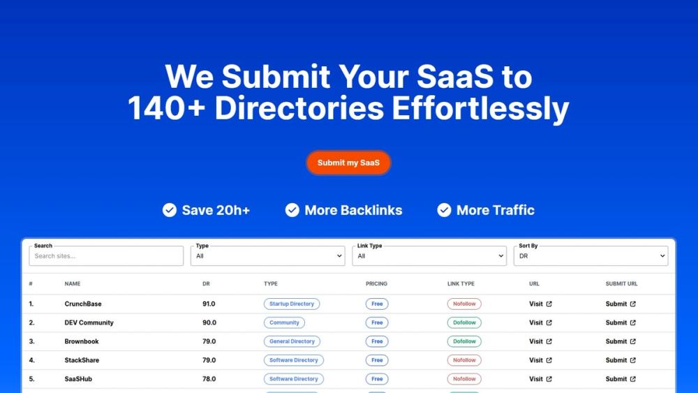 SubmitSaaS uses AI automation to revolutionize SaaS visibility. We submit your product to 100+ high-quality, curated directories, streamlining the entire process. This saves you over 20 hours of valuable manual effort. Our AI-powered platform eliminates technical submission headaches, significantly boosting your SEO, expanding your reach, and attracting more targeted customers effortlessly. We handle all details, from dedicated email setup to providing a detailed submission report, ensuring maximum impact and accelerated growth for your SaaS with minimal effort from you.